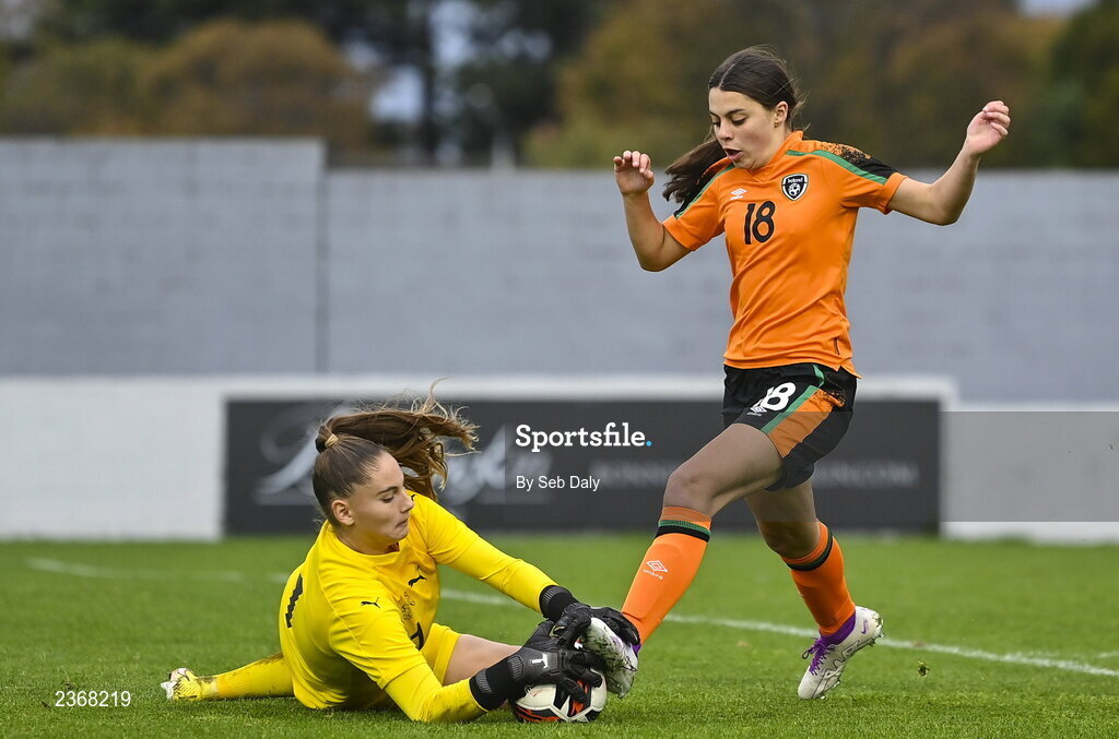 3 November 2022; Hannah O'Brien of Republic of Ireland in action against Switzerland goalkeeper Lea Kramoviku during the Women's U16 International Friendly match between Republic of Ireland and Switzerland at Whitehall Stadium in Dublin. Photo by Seb Daly/Sportsfile