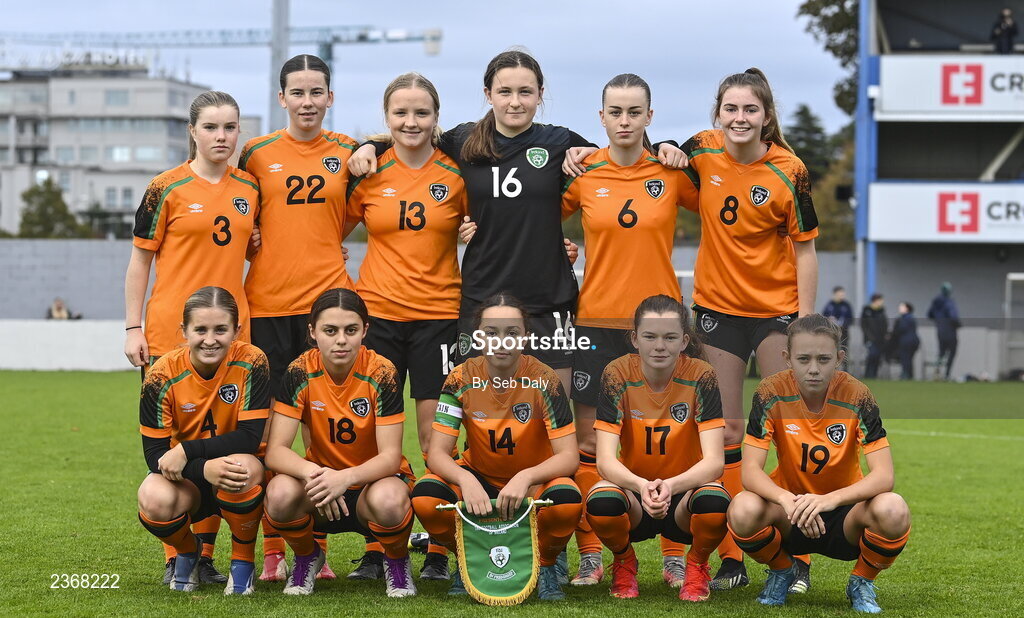 3 November 2022; The Republic of Ireland team, bacl row, from left, Sorcha Melia, Rebecca Devereux, Ciara Fitzpatrick, Clodagh Fitzgerald, Kayla Maguire and Finley Newell, front row, from left, Lucy O'Rourke, Hannah O'Brien, Amy Tierney, Aoibhe Brennan and Lauryn McCabe before the Women's U16 International Friendly match between Republic of Ireland and Switzerland at Whitehall Stadium in Dublin. Photo by Seb Daly/Sportsfile