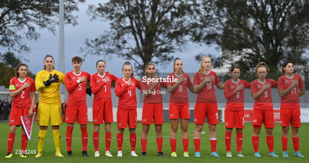 3 November 2022; Switzerland players before the Women's U16 International Friendly match between Republic of Ireland and Switzerland at Whitehall Stadium in Dublin. Photo by Seb Daly/Sportsfile