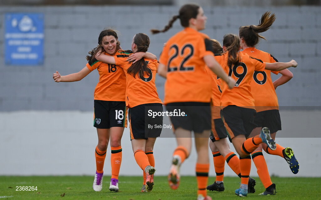 3 November 2022; Hannah O'Brien of Republic of Ireland, left, celebrates with teammates after scoring their side's first goal during the Women's U16 International Friendly match between Republic of Ireland and Switzerland at Whitehall Stadium in Dublin. Photo by Seb Daly/Sportsfile
