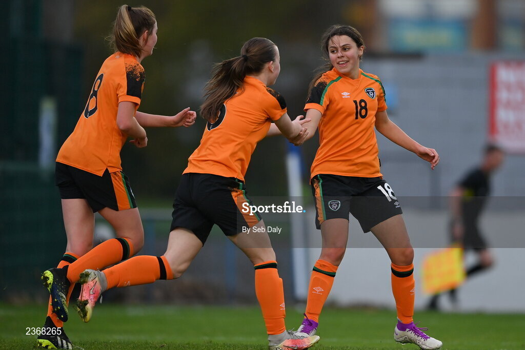 3 November 2022; Hannah O'Brien of Republic of Ireland, right, celebrates with teammates after scoring their side's first goal during the Women's U16 International Friendly match between Republic of Ireland and Switzerland at Whitehall Stadium in Dublin. Photo by Seb Daly/Sportsfile