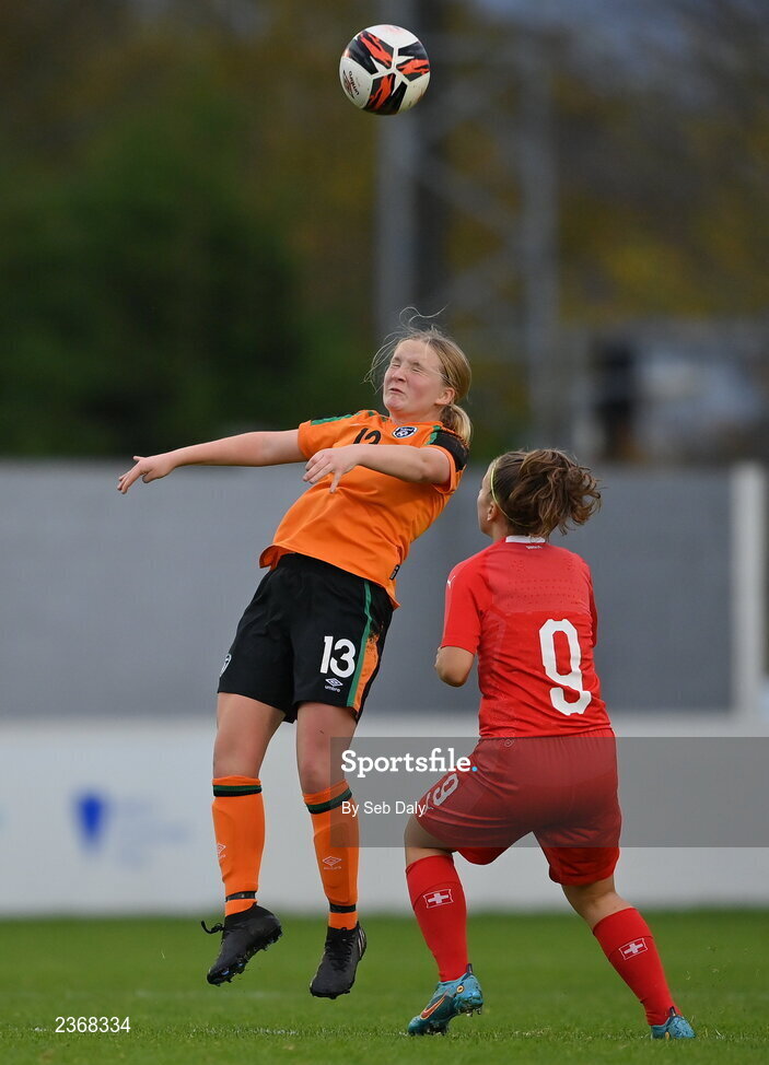3 November 2022; Ciara Fitzpatrick of Republic of Ireland in action against Anida Mujela of Switzerland during the Women's U16 International Friendly match between Republic of Ireland and Switzerland at Whitehall Stadium in Dublin. Photo by Seb Daly/Sportsfile