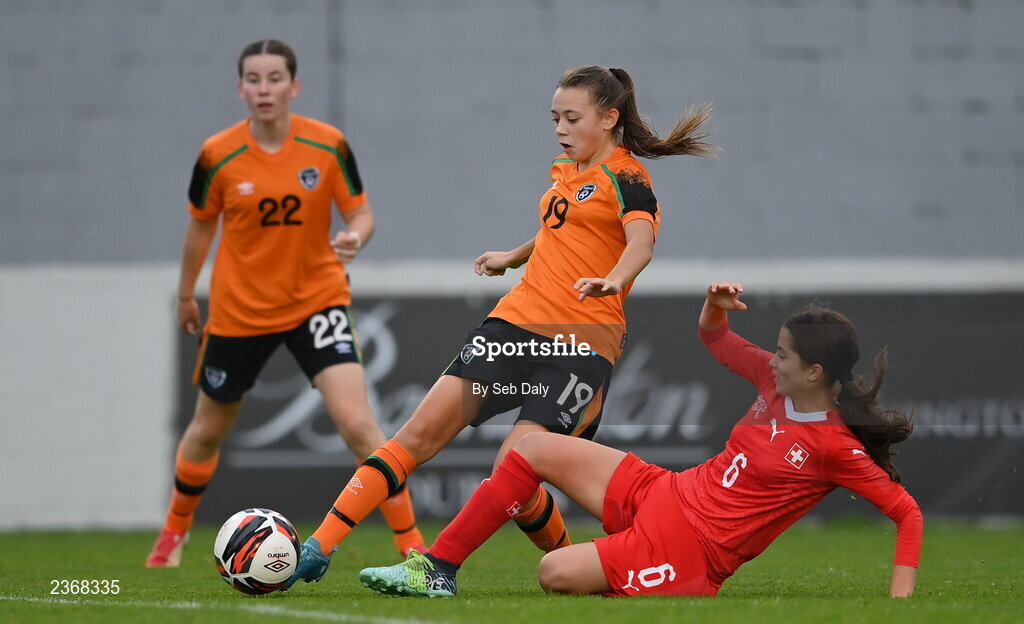 3 November 2022; Lauryn McCabe of Republic of Ireland in action against Melissa Rondalli of Switzerland during the Women's U16 International Friendly match between Republic of Ireland and Switzerland at Whitehall Stadium in Dublin. Photo by Seb Daly/Sportsfile