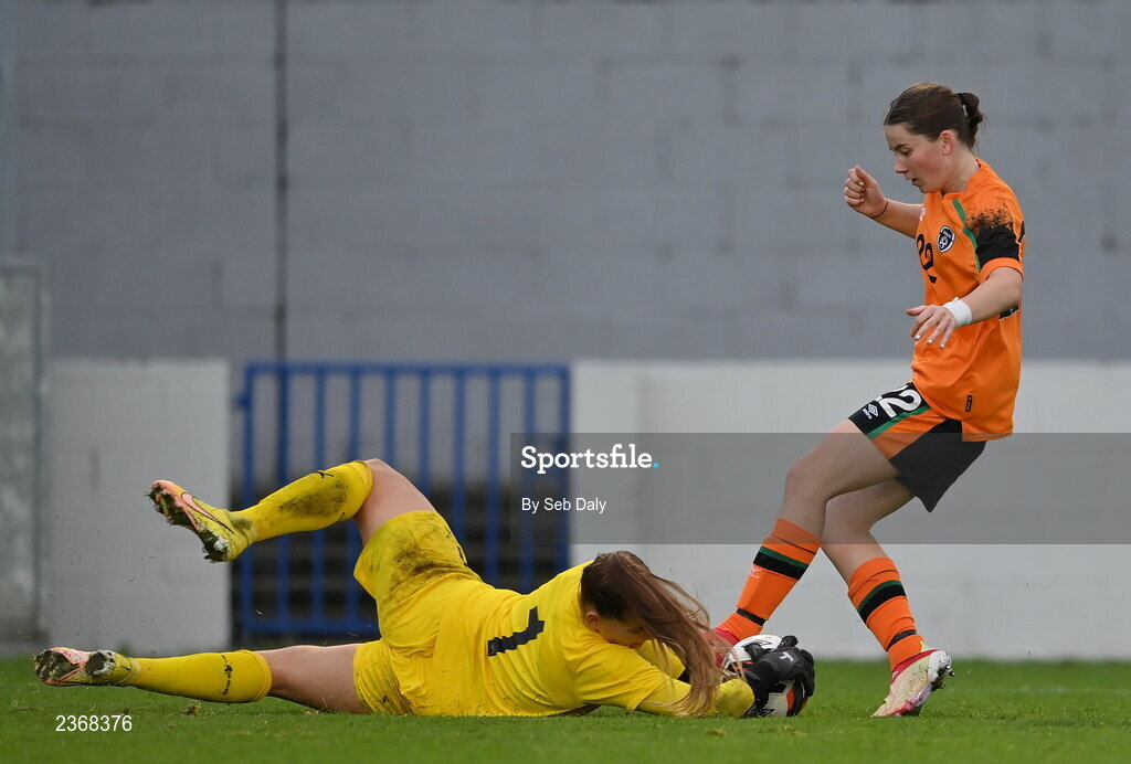 3 November 2022; Rebecca Devereux of Republic of Ireland Switzerland goalkeeper Lea Kramoviku during the Women's U16 International Friendly match between Republic of Ireland and Switzerland at Whitehall Stadium in Dublin. Photo by Seb Daly/Sportsfile