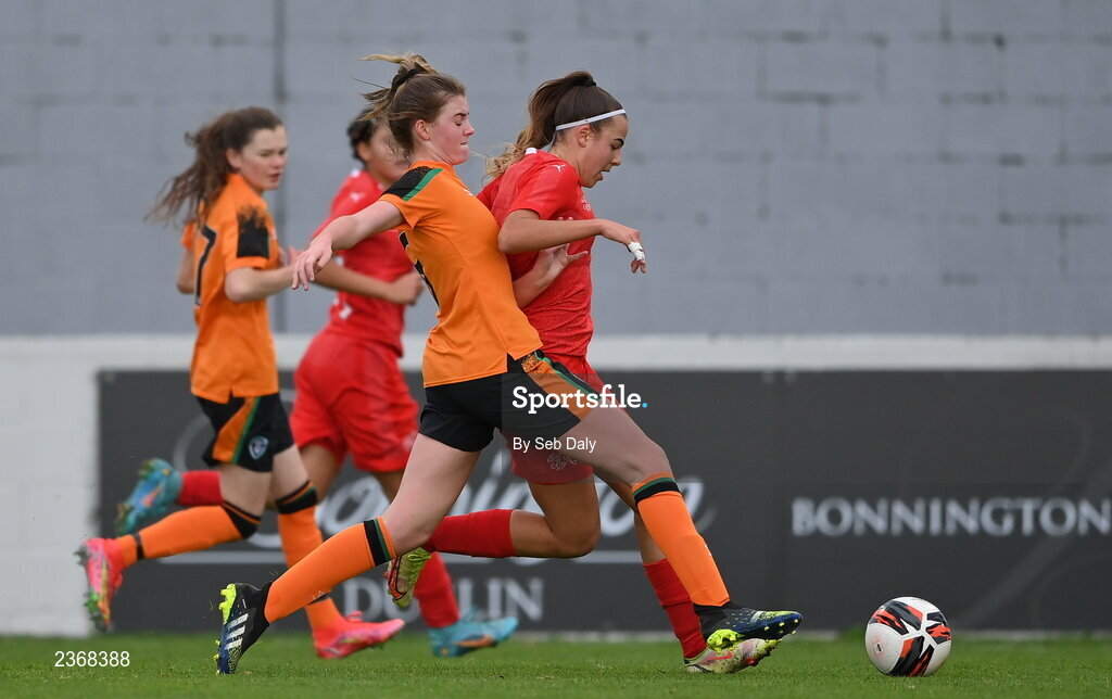 3 November 2022; Emma Egli of Switzerland in action against Finley Newell of Republic of Ireland during the Women's U16 International Friendly match between Republic of Ireland and Switzerland at Whitehall Stadium in Dublin. Photo by Seb Daly/Sportsfile