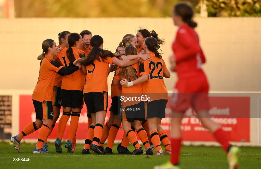 3 November 2022; Libby Bermingham of Republic of Ireland celebrates with teammates after scoring their side's third goal during the Women's U16 International Friendly match between Republic of Ireland and Switzerland at Whitehall Stadium in Dublin. Photo by Seb Daly/Sportsfile