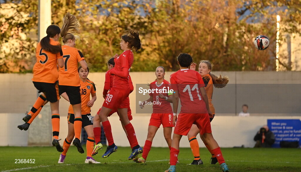 3 November 2022; Libby Bermingham of Republic of Ireland, second from left, scores her side's third goal during the Women's U16 International Friendly match between Republic of Ireland and Switzerland at Whitehall Stadium in Dublin. Photo by Seb Daly/Sportsfile