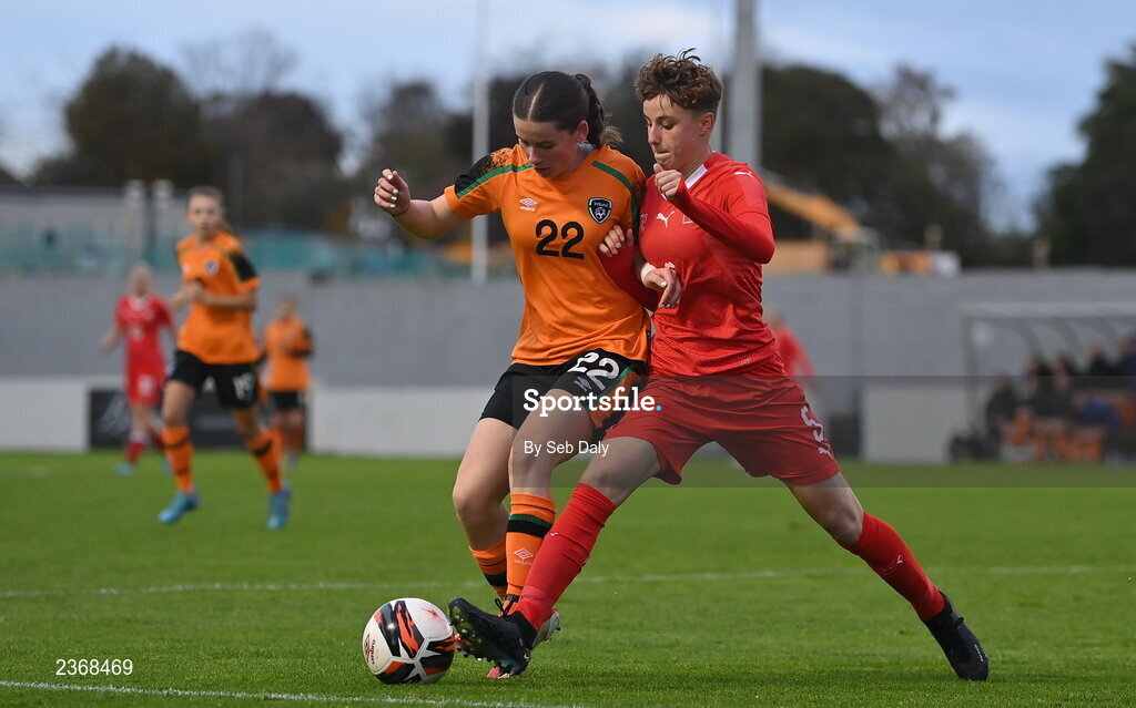 3 November 2022; Rebecca Devereux of Republic of Ireland in action against Andrea Jägi of Switzerland during the Women's U16 International Friendly match between Republic of Ireland and Switzerland at Whitehall Stadium in Dublin. Photo by Seb Daly/Sportsfile