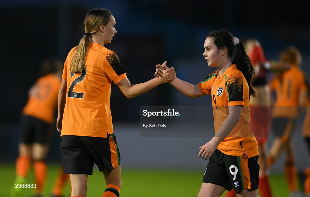 3 November 2022; Oralith Doherty, right, and Cache Crumlish of Republic of Ireland after their side's victory in the Women's U16 International Friendly match between Republic of Ireland and Switzerland at Whitehall Stadium in Dublin. Photo by Seb Daly/Sportsfile