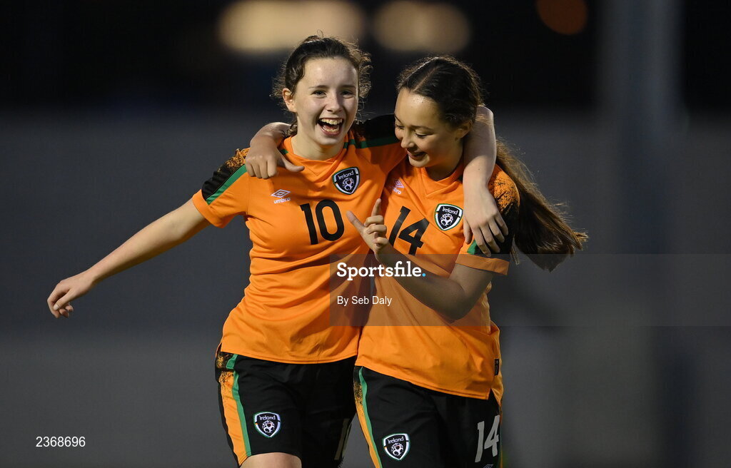 3 November 2022; Emma Duffy, left, and Amy Tierney of Republic of Ireland after their side's victory in the Women's U16 International Friendly match between Republic of Ireland and Switzerland at Whitehall Stadium in Dublin. Photo by Seb Daly/Sportsfile