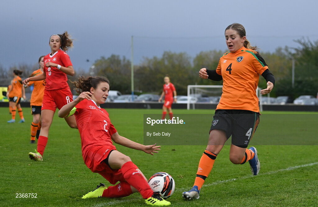 3 November 2022; Lucy O'Rourke of Republic of Ireland in action against Nathalie Widmer of Switzerland during the Women's U16 International Friendly match between Republic of Ireland and Switzerland at Whitehall Stadium in Dublin. Photo by Seb Daly/Sportsfile
