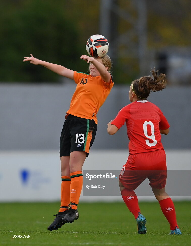 3 November 2022; Ciara Fitzpatrick of Republic of Ireland in action against Anida Mujela of Switzerland during the Women's U16 International Friendly match between Republic of Ireland and Switzerland at Whitehall Stadium in Dublin. Photo by Seb Daly/Sportsfile