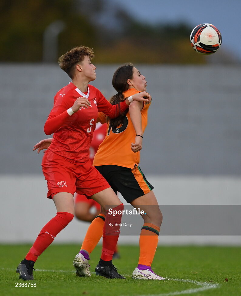 3 November 2022; Hannah O'Brien of Republic of Ireland in action against Andrea Jägi of Switzerland during the Women's U16 International Friendly match between Republic of Ireland and Switzerland at Whitehall Stadium in Dublin. Photo by Seb Daly/Sportsfile
