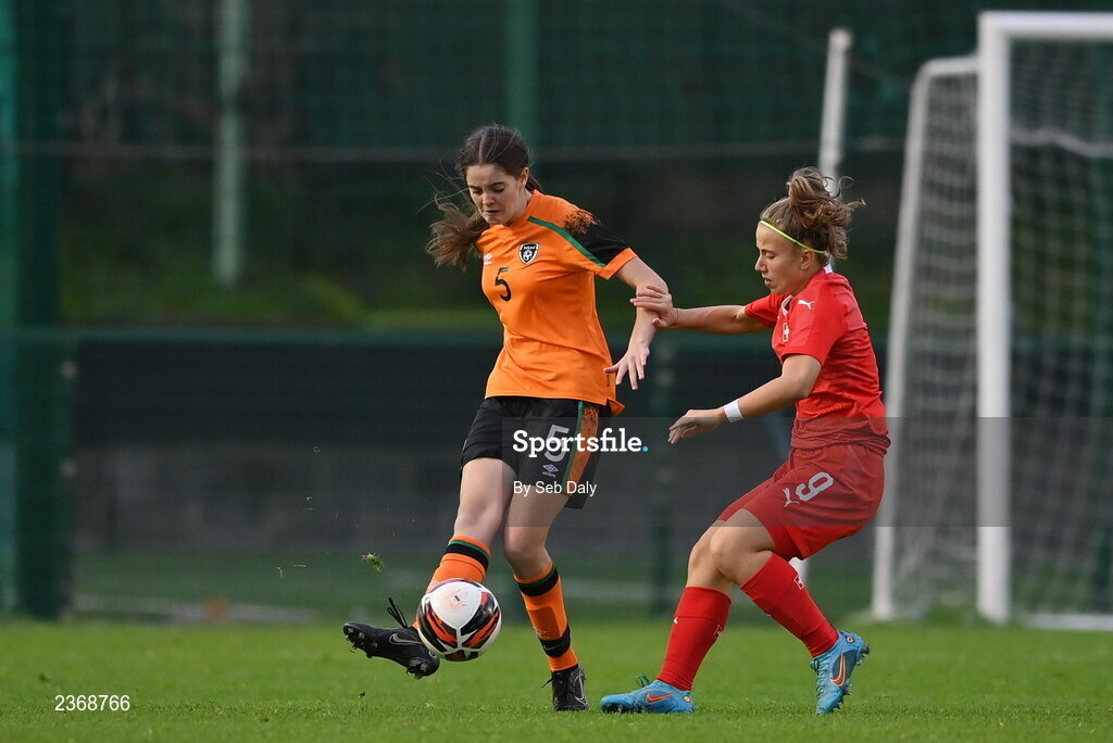 3 November 2022; Chloe Wallace of Republic of Ireland in action against Anida Mujela of Switzerland during the Women's U16 International Friendly match between Republic of Ireland and Switzerland at Whitehall Stadium in Dublin. Photo by Seb Daly/Sportsfile