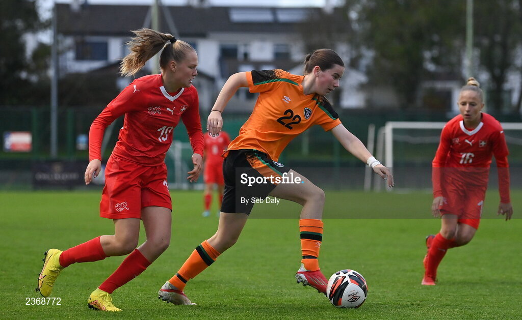 3 November 2022; Rebecca Devereux of Republic of Ireland in action against Nayana Ebersold of Switzerland during the Women's U16 International Friendly match between Republic of Ireland and Switzerland at Whitehall Stadium in Dublin. Photo by Seb Daly/Sportsfile