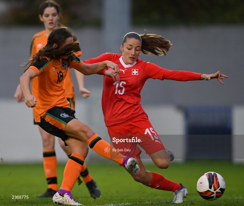 3 November 2022; Hannah O'Brien of Republic of Ireland in action against Nayana Ebersold of Switzerland during the Women's U16 International Friendly match between Republic of Ireland and Switzerland at Whitehall Stadium in Dublin. Photo by Seb Daly/Sportsfile