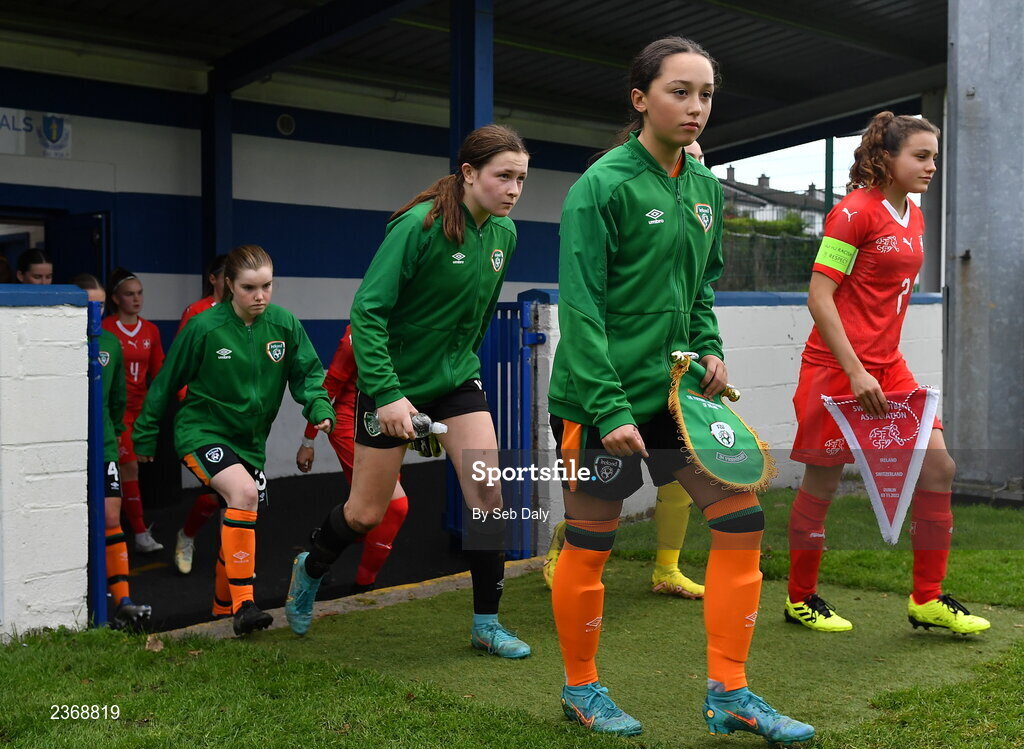 3 November 2022; Republic of Ireland captain Amy Tierney leads her side out before the Women's U16 International Friendly match between Republic of Ireland and Switzerland at Whitehall Stadium in Dublin. Photo by Seb Daly/Sportsfile