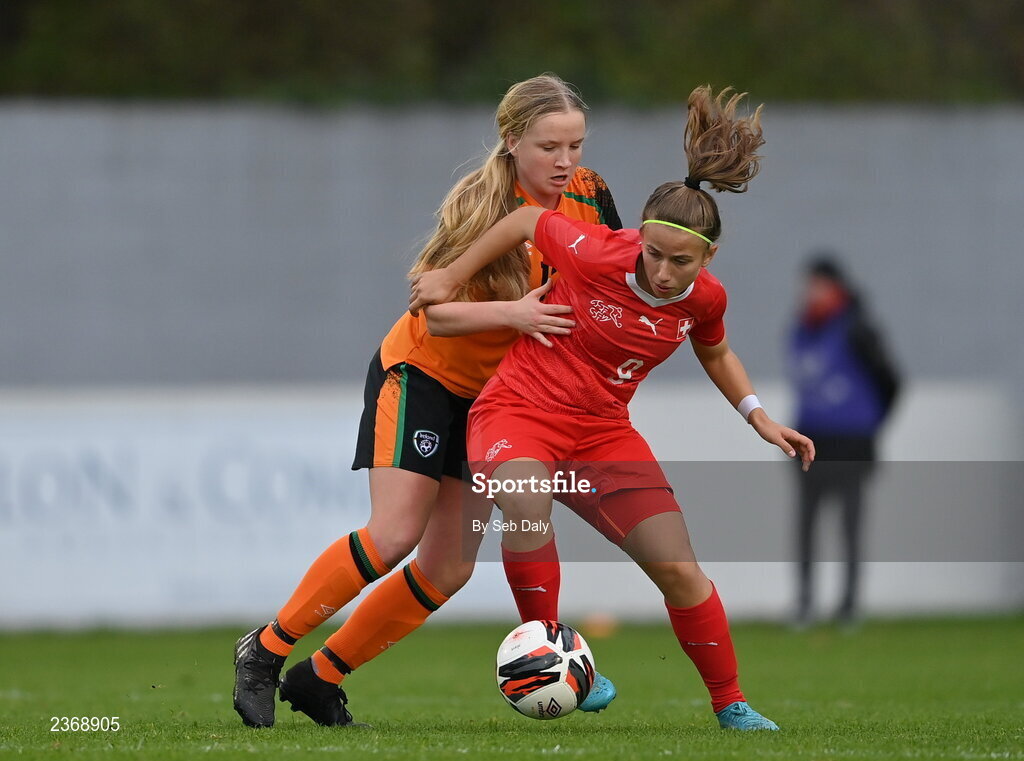 3 November 2022; Anida Mujela of Switzerland in action against Ciara Fitzpatrick of Republic of Ireland during the Women's U16 International Friendly match between Republic of Ireland and Switzerland at Whitehall Stadium in Dublin. Photo by Seb Daly/Sportsfile