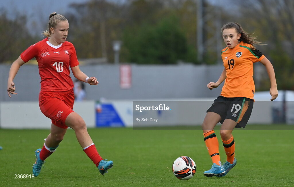 3 November 2022; Lauryn McCabe of Republic of Ireland in action against Sheila Herger of Switzerland during the Women's U16 International Friendly match between Republic of Ireland and Switzerland at Whitehall Stadium in Dublin. Photo by Seb Daly/Sportsfile