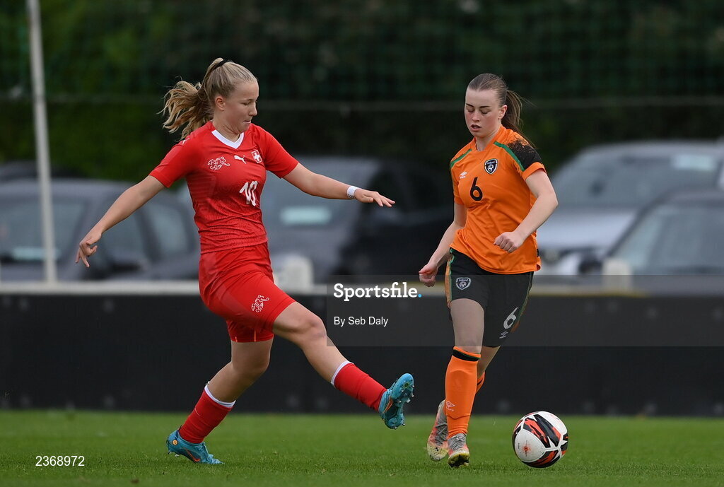 3 November 2022; Kayla Maguire of Republic of Ireland in action against Sheila Herger of Switzerland during the Women's U16 International Friendly match between Republic of Ireland and Switzerland at Whitehall Stadium in Dublin. Photo by Seb Daly/Sportsfile