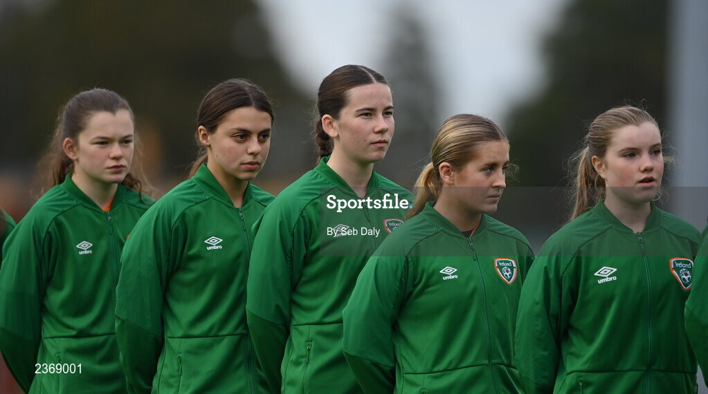 3 November 2022; Republic of Ireland players, from right, Sorcha Melia, Lucy O'Rourke, Rebecca Devereux, Hannah O'Brien and Aoibhe Brennan before the Women's U16 International Friendly match between Republic of Ireland and Switzerland at Whitehall Stadium in Dublin. Photo by Seb Daly/Sportsfile