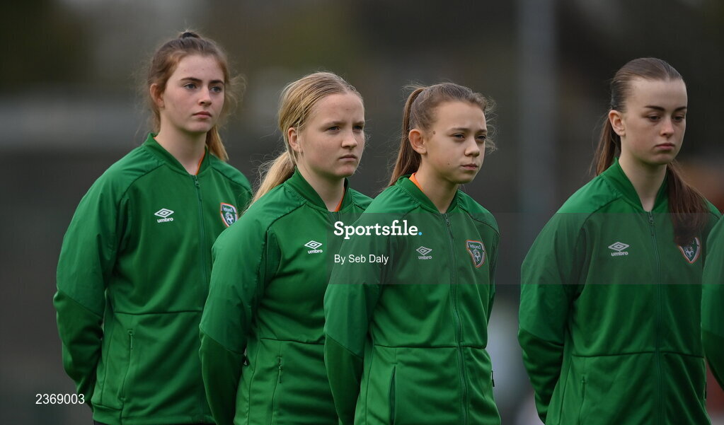 3 November 2022; Republic of Ireland players, from right, Kayla Maguire, Lauryn McCabe, Ciara Fitzpatrick and Finley Newell before the Women's U16 International Friendly match between Republic of Ireland and Switzerland at Whitehall Stadium in Dublin. Photo by Seb Daly/Sportsfile