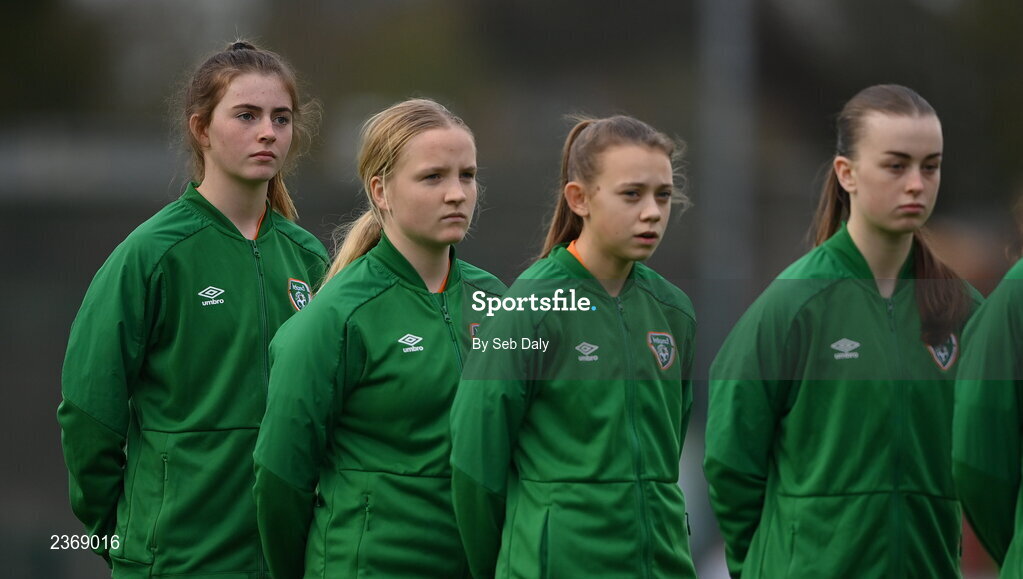 3 November 2022; Republic of Ireland players, from left, Finley Newell, Ciara Fitzpatrick, Lauryn McCabe and Kayla Maguire before the Women's U16 International Friendly match between Republic of Ireland and Switzerland at Whitehall Stadium in Dublin. Photo by Seb Daly/Sportsfile