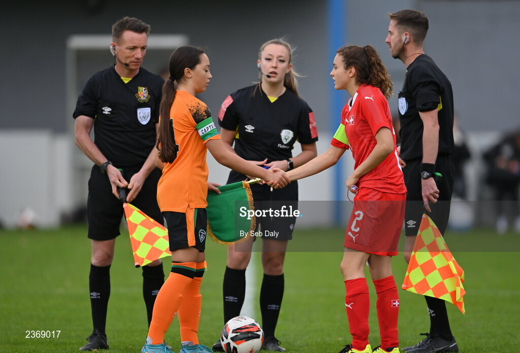 3 November 2022; Republic of Ireland captain Amy Tierney and Switzerland captain Nathalie Widmer shake hands before the Women's U16 International Friendly match between Republic of Ireland and Switzerland at Whitehall Stadium in Dublin. Photo by Seb Daly/Sportsfile