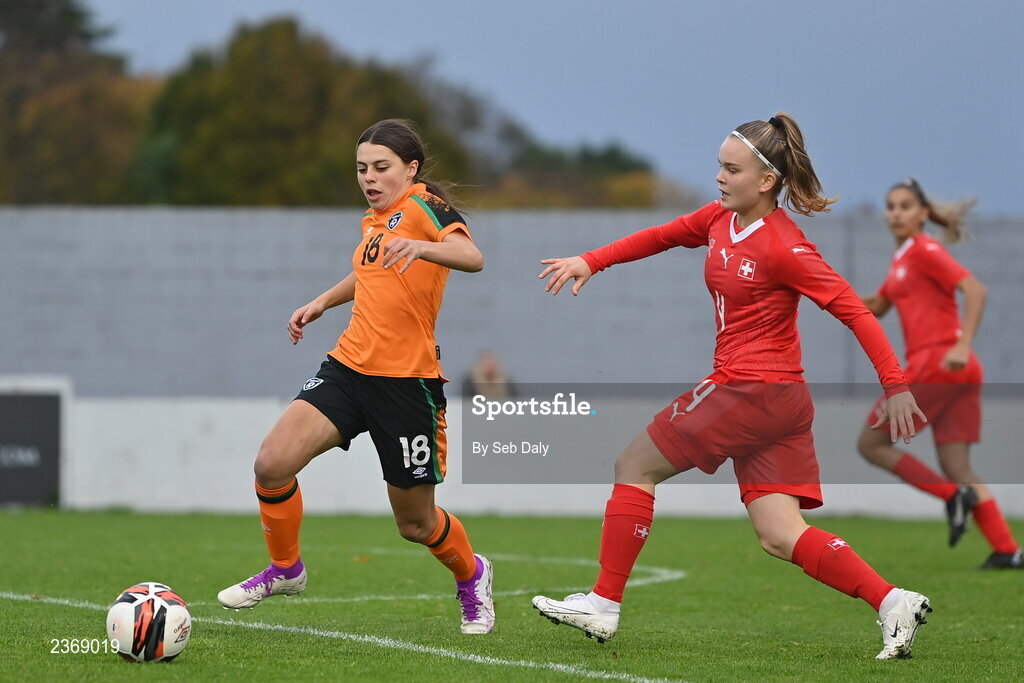 3 November 2022; Hannah O'Brien of Republic of Ireland in action against Anais Gygax of Switzerland during the Women's U16 International Friendly match between Republic of Ireland and Switzerland at Whitehall Stadium in Dublin. Photo by Seb Daly/Sportsfile
