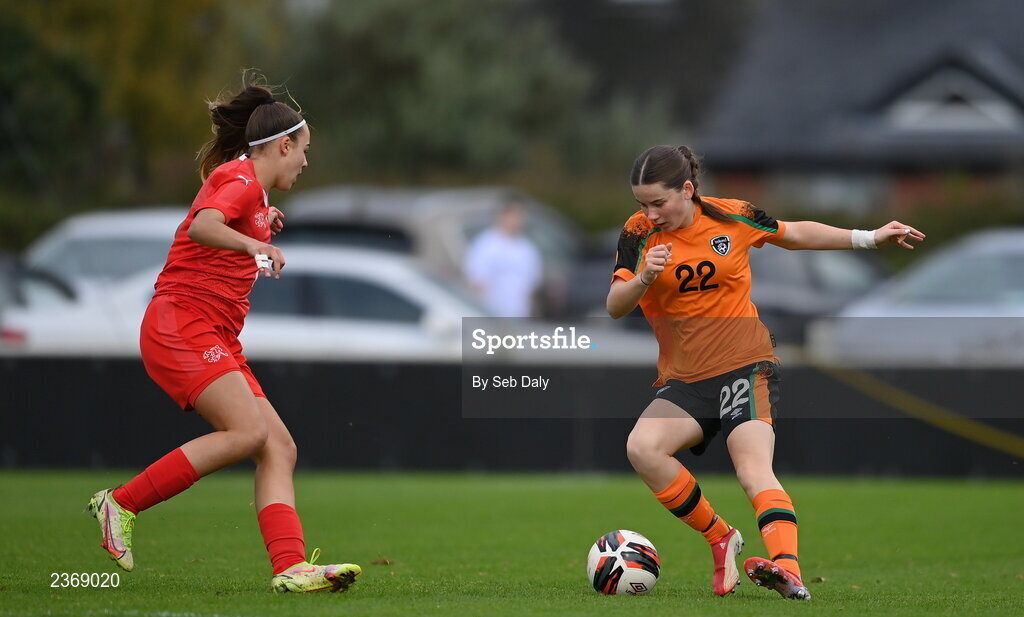 3 November 2022; Rebecca Devereux of Republic of Ireland in action against Emma Egli of Switzerland during the Women's U16 International Friendly match between Republic of Ireland and Switzerland at Whitehall Stadium in Dublin. Photo by Seb Daly/Sportsfile