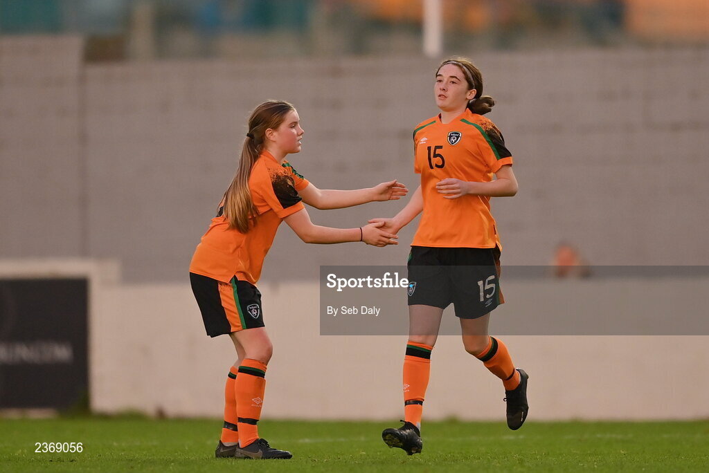 3 November 2022; Sarah McCaffrey, right, and Sorcha Melia of Republic of Ireland during the Women's U16 International Friendly match between Republic of Ireland and Switzerland at Whitehall Stadium in Dublin. Photo by Seb Daly/Sportsfile