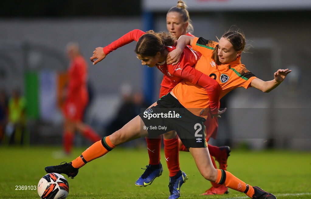 3 November 2022; Cache Crumlish of Republic of Ireland in action against Paulina Stanic of Switzerland during the Women's U16 International Friendly match between Republic of Ireland and Switzerland at Whitehall Stadium in Dublin. Photo by Seb Daly/Sportsfile