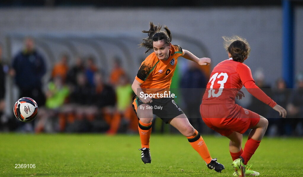3 November 2022; Oralith Doherty of Republic of Ireland in action against Anika Seliner of Switzerland during the Women's U16 International Friendly match between Republic of Ireland and Switzerland at Whitehall Stadium in Dublin. Photo by Seb Daly/Sportsfile