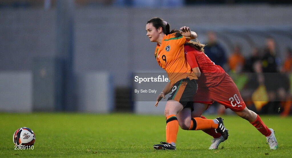 3 November 2022; Oralith Doherty of Republic of Ireland in action against Chiara Wallin of Switzerland during the Women's U16 International Friendly match between Republic of Ireland and Switzerland at Whitehall Stadium in Dublin. Photo by Seb Daly/Sportsfile