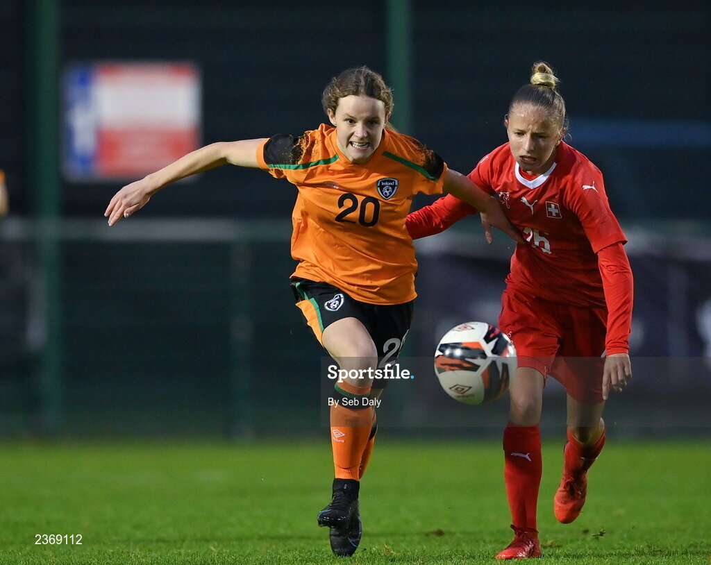 3 November 2022; Ava Mullins of Republic of Ireland in action against Andrea Schenk of Switzerland during the Women's U16 International Friendly match between Republic of Ireland and Switzerland at Whitehall Stadium in Dublin. Photo by Seb Daly/Sportsfile