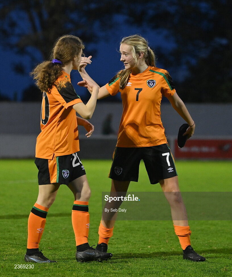 3 November 2022; Ava Mullins, left, and Libby Bermingham of Republic of Ireland after their side's victory in the Women's U16 International Friendly match between Republic of Ireland and Switzerland at Whitehall Stadium in Dublin. Photo by Seb Daly/Sportsfile