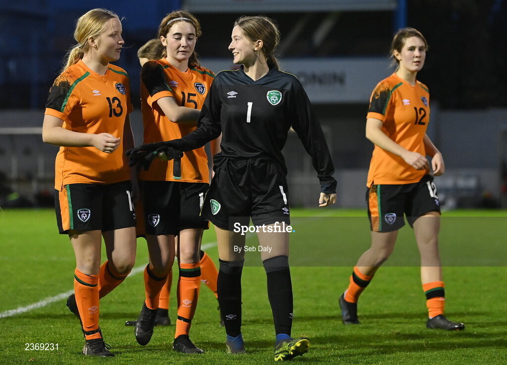 3 November 2022; Republic of Ireland players, from left, Ciara Fitzpatrick, Sarah McCaffrey and Laura Fanning after their side's victory in the Women's U16 International Friendly match between Republic of Ireland and Switzerland at Whitehall Stadium in Dublin. Photo by Seb Daly/Sportsfile