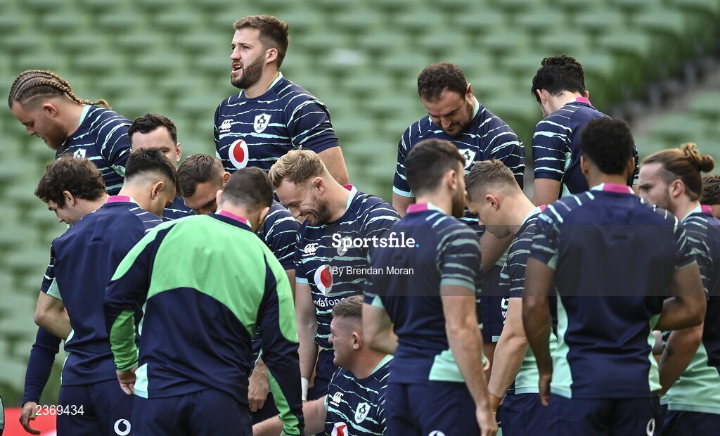 4 November 2022; Stuart McCloskey prepares for the team photograph before Ireland captain's run at the Aviva Stadium in Dublin. Photo by Brendan Moran/Sportsfile