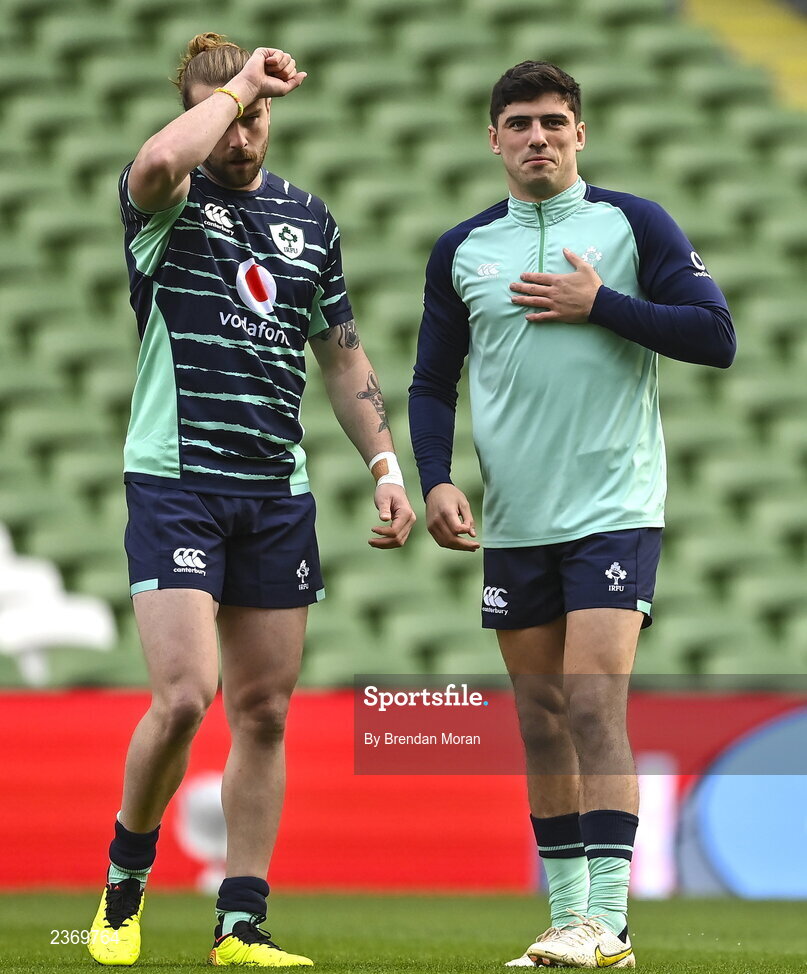 4 November 2022; Mack Hansen, left, and Jimmy O'Brien during the Ireland captain's run at the Aviva Stadium in Dublin. Photo by Brendan Moran/Sportsfile