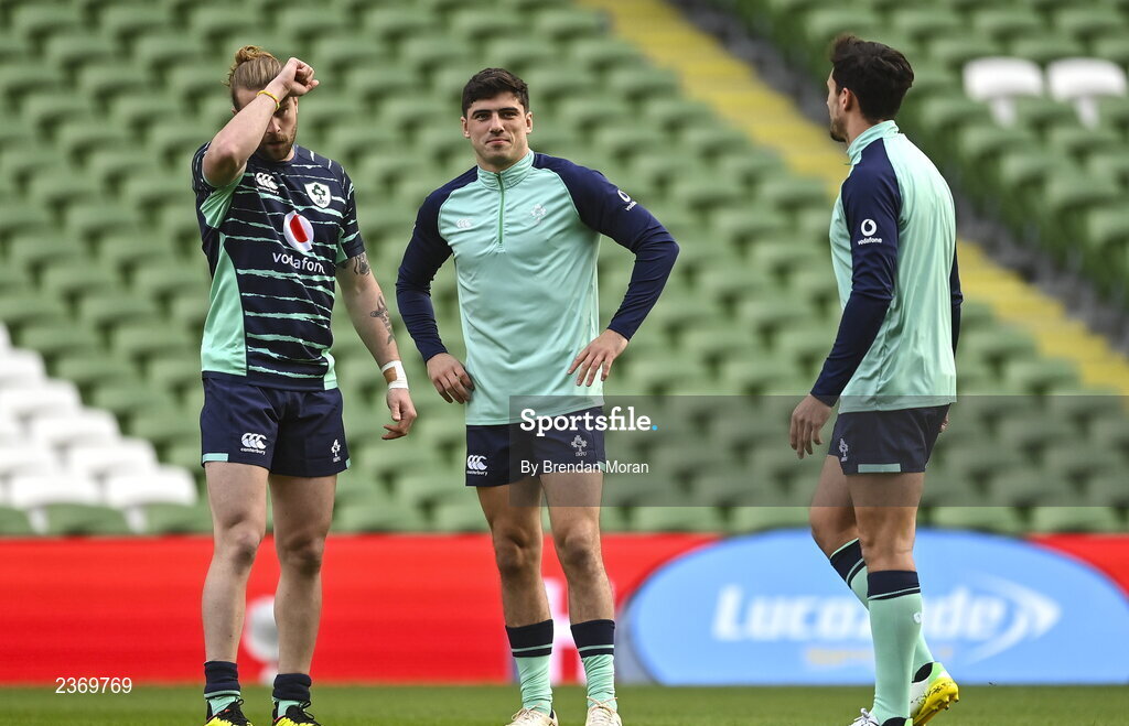 4 November 2022; Mack Hansen, left, Jimmy O'Brien and Joey Carbery, right, during the Ireland captain's run at the Aviva Stadium in Dublin. Photo by Brendan Moran/Sportsfile