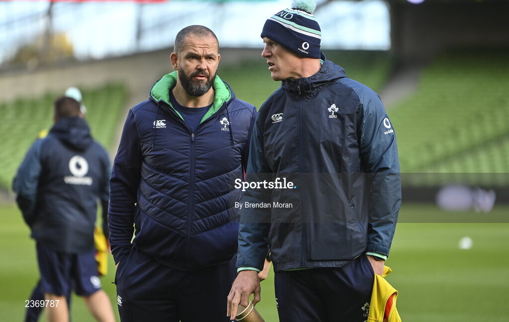 4 November 2022; Head coach Andy Farrell, left, and forwards coach Paul O'Connell during the Ireland captain's run at the Aviva Stadium in Dublin. Photo by Brendan Moran/Sportsfile