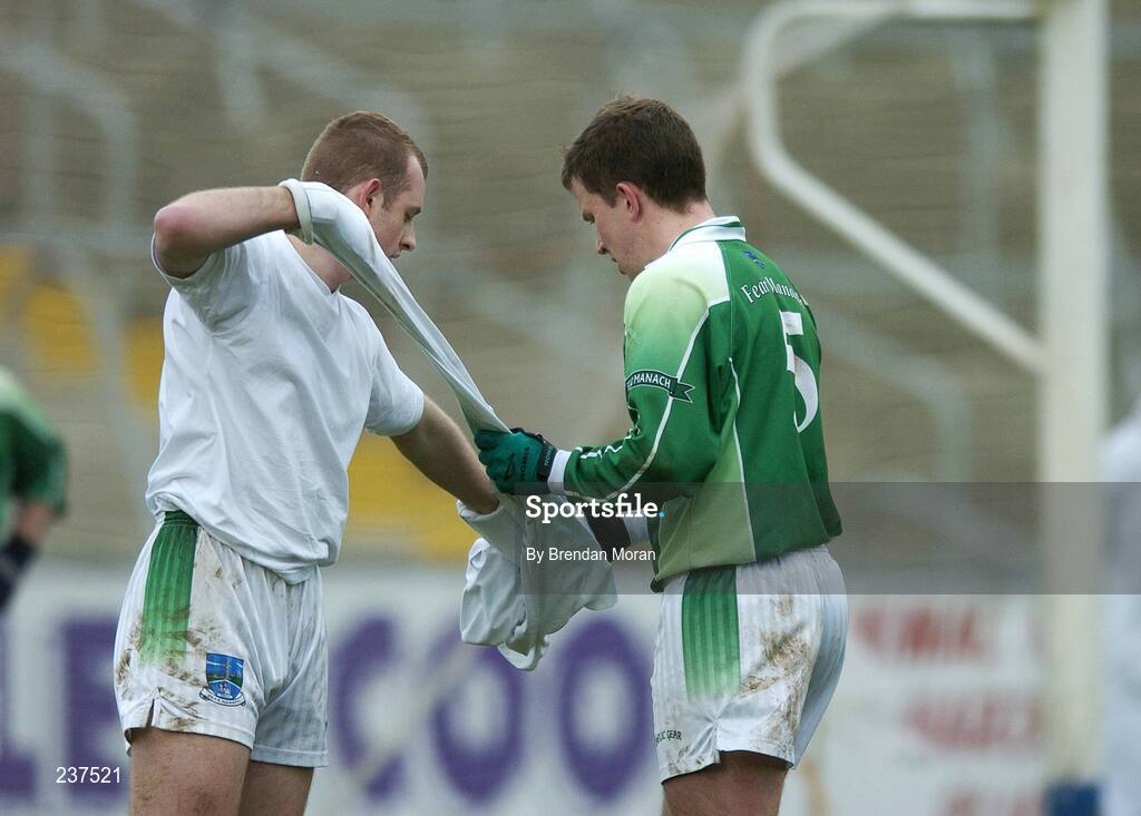 25 February 2007; Fermanagh goalkeeper Christopher Breen gives his goalkeeper jersey to team-mate Shane McDermott after being shown a straight red card by referee Michael Hughes. Allianz National Football League, Division 1A, Round 3, Fermanagh v Kerry, Kingspan Breffni Park, Cavan. Picture Credit: Brendan Moran / SPORTSFILE