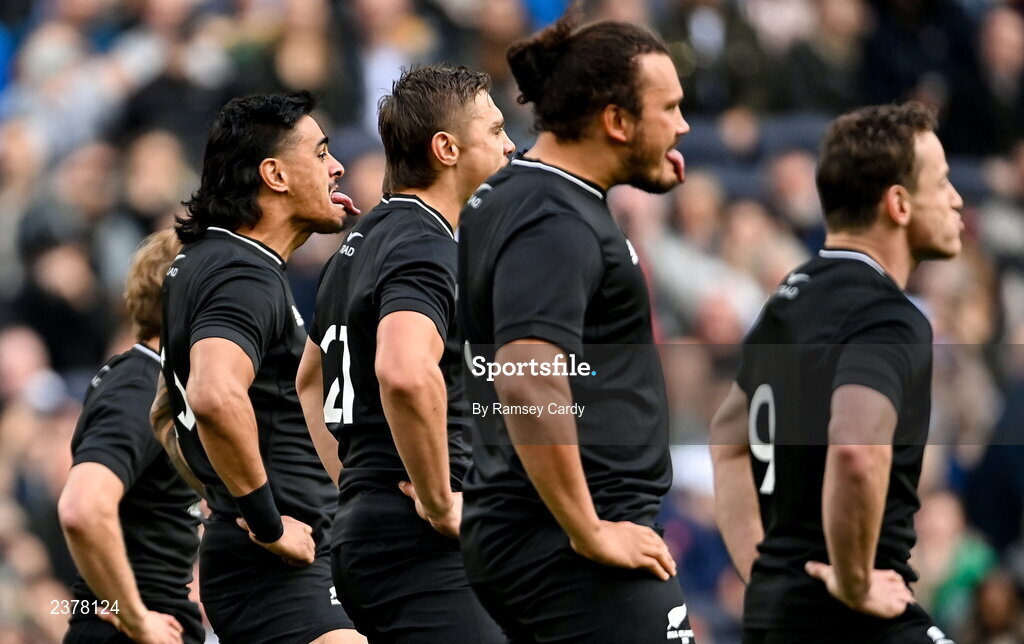 13 November 2022; Bailyn Sullivan of All Blacks XV and his All Blacks XV teammates perform the Haka before the Killik Cup match between Barbarians and All Blacks XV at Tottenham Hotspur Stadium in London, England. Photo by Ramsey Cardy/Sportsfile