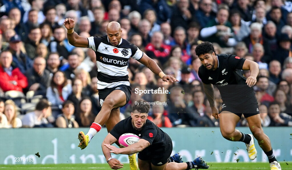 13 November 2022; Alex Nankivell of All Blacks XV in action against Teddy Thomas of Barbarians during the Killik Cup match between Barbarians and All Blacks XV at Tottenham Hotspur Stadium in London, England. Photo by Ramsey Cardy/Sportsfile