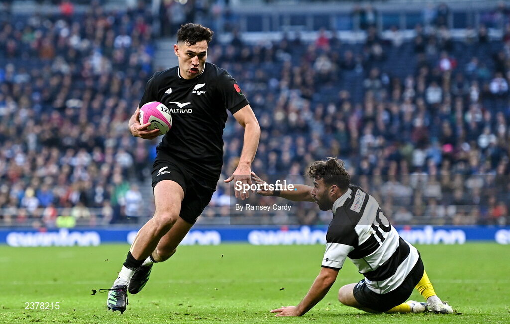 13 November 2022; Shaun Stevenson of All Blacks XV evades the tackle of Antoine Hastoy of Barbarians on his way to scoring his side's fourth try during the Killik Cup match between Barbarians and All Blacks XV at Tottenham Hotspur Stadium in London, England. Photo by Ramsey Cardy/Sportsfile