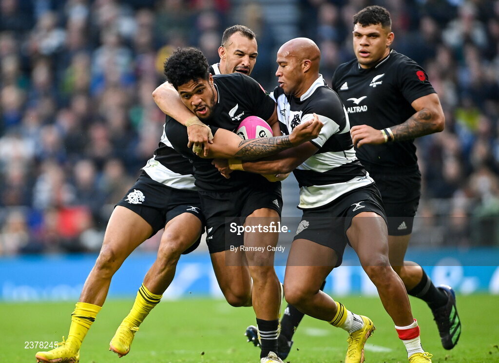 13 November 2022; Leicester Fainga'anuku of All Blacks XV is tackled by Dillyn Leyds, left, and Teddy Thomas of Barbarians during the Killik Cup match between Barbarians and All Blacks XV at Tottenham Hotspur Stadium in London, England. Photo by Ramsey Cardy/Sportsfile