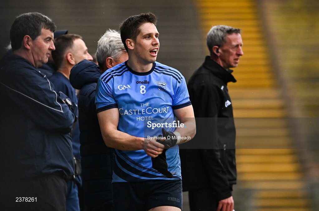 13 November 2022; Lee Keegan of Westport leaves the pitch after being shown two yellow cards in sixteen seconds, and a subsequent red card by referee Paddy Neilan, not pictured, during the AIB Connacht GAA Football Senior Club Championship Quarter-Final match between Moycullen and Westport at Hastings Insurance MacHale Park in Castlebar, Mayo. Photo by Piaras Ó Mídheach/Sportsfile