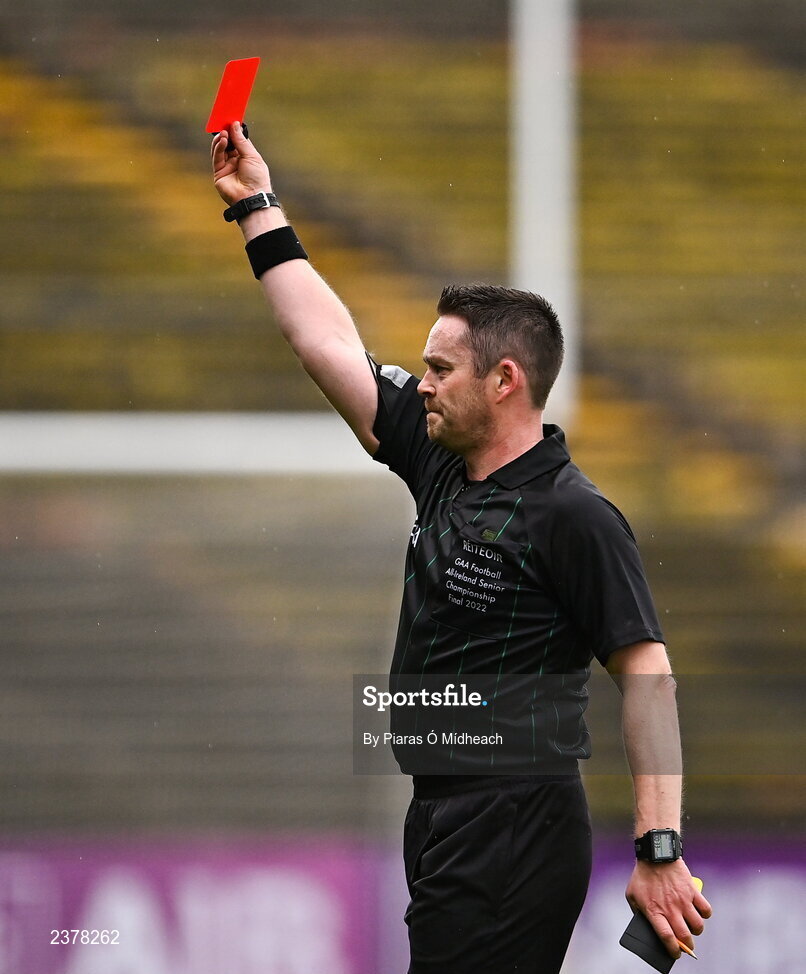 13 November 2022; Referee Paddy Neilan shows the red card to Lee Keegan, not pictured, after he was shown two yellow cards in sixteen seconds, during the AIB Connacht GAA Football Senior Club Championship Quarter-Final match between Moycullen and Westport at Hastings Insurance MacHale Park in Castlebar, Mayo. Photo by Piaras Ó Mídheach/Sportsfile