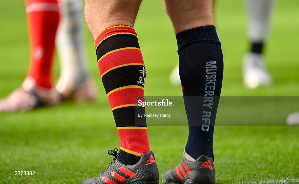 13 November 2022; A general view of the socks of John Ryan of Barbarians, his school Christian Brothers College, and club Muskerry RFC, during the Killik Cup match between Barbarians and All Blacks XV at Tottenham Hotspur Stadium in London, England. Photo by Ramsey Cardy/Sportsfile