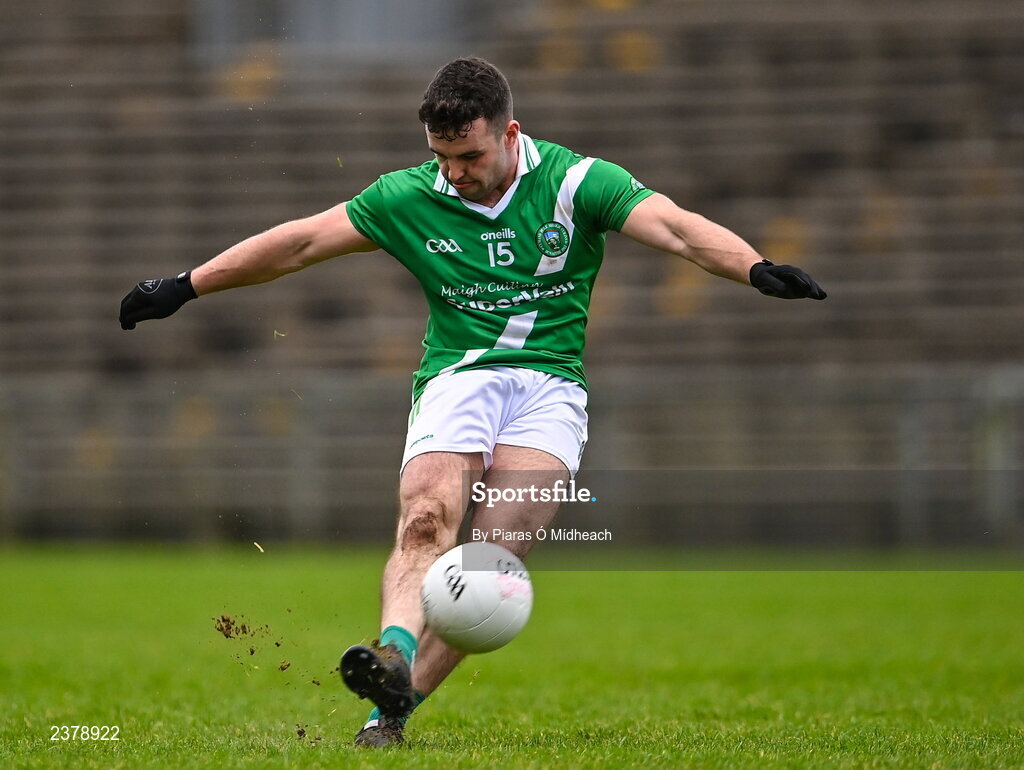 13 November 2022; Dessie Conneely of Moycullen takes a free during the AIB Connacht GAA Football Senior Club Championship Quarter-Final match between Moycullen and Westport at Hastings Insurance MacHale Park in Castlebar, Mayo. Photo by Piaras Ó Mídheach/Sportsfile